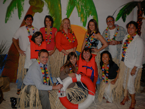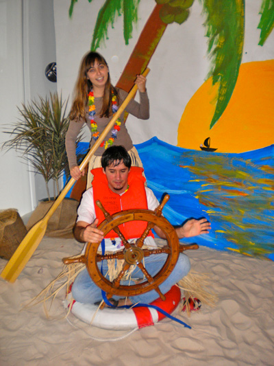 No one was in the conference room. In fact, other than the interns, the office seemed pretty much empty — typical for lunch hour. I was overcome with feelings of remorse as it dawned on me: “Oh no…OH NO,” I said, “I am SUCH A JERK…” as I rounded the corner, and out popped the whole BG crew from around the lobby corner, donning life jackets and hula skirts and leis. The lobby floor was covered in 4″ of sand, there was a mural with a sunset and a boat on the horizon, and on the bow of the boat, Santa! There were palm trees, fishing nets, oars, life rings, a ship’s wheel, lobsters and crabs…and a Maori warrior peeking out from behind the mural! It was INCREDIBLE! I had no idea. I’ve been so occupied for so many weeks with so many things that a farewell party hadn’t even crossed my mind.