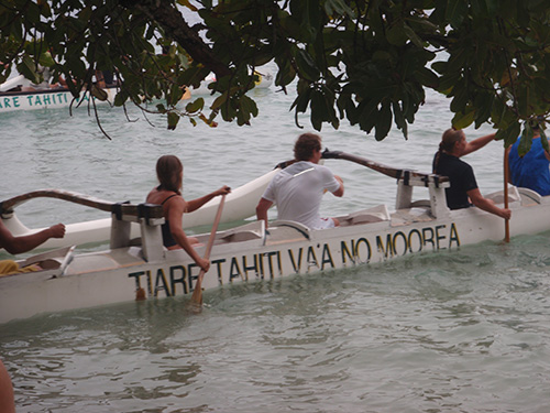 After a night of 30 knot winds, we awoke to a drizzly morning in Moorea. The Puddle Jump folks had a whole day of sports and Polynesian activities scheduled for us, so we made our way to shore in the rain and paired up with another boat to make a team. We did outrigger canoe races, a fruit carrying race (2 full banana stalks strapped onto a bamboo pole like barbell), and a tug of war. Jason took on the banana barbells and out ran every other man who tried today. I was so proud! He ended up winning a heavy carved wood sculpture shaped like Moorea and etched with the event logo. We really wanted the canoe paddle, but the canoe race winners got that, so another pickle dish will do. It’s quite heavy, so we’ll have to figure out how to get it home.
