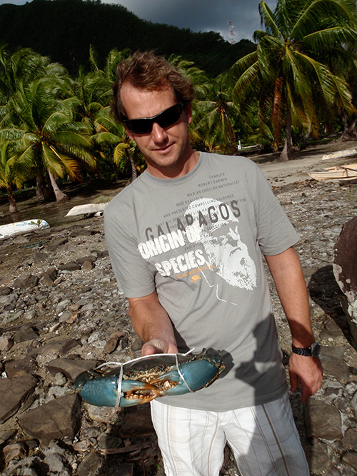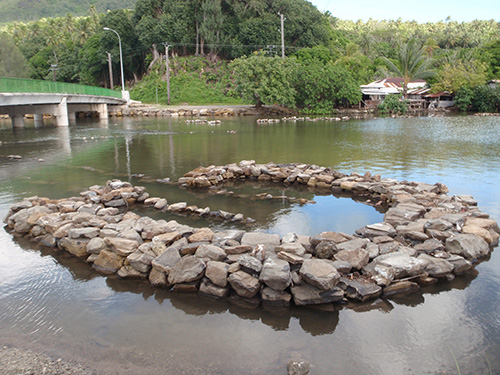 On the north side of Huahine Nui, toward the village of Maeva, are 400-year-old fish traps engineered by a village priest, who told his citizens where to place the stones in the channel between the main island and one of its motus. The traps are essentially walls of large stones stacked in patterns according to the current, that allow fish to swim into a brackish lake from the sea. When the tide recedes, the fish cannot find a way out. Villagers can then walk out on the stones and catch the fish in hand-built nets. The crabs in the lake aren’t too shabby either. They’re some of the largest blue crab relatives I’ve ever seen—10-12″ across with stone crab size claws. The villagers build unique nets for catching these. They are circular, with a dome-shaped X of sticks across the top, to which fishermen tie a scrap of fish meat. Thin bamboo poles are tied to the nets and the circular nets are set on the bottom. The poles float, so in an hour or two, the fishermen come back around and pick the nets up by the poles, and the crab that is sitting under the sticks munching on a hunk of bait above his head just gets caught up in the net below his feet and lifted onto a canoe.