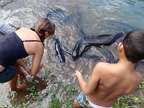 Huahine’s claim to fame is its sacred freshwater eels, which have been fed by children in the community for generations, rendering the population in the local stream almost tame. The eels reach about 2m in length, have blue eyes, and won’t be shy about biting you if they think you have food in your hand, so move quickly! I think really they’re mostly blind, hence the blue eyes. This was the highlight of our tour to me (they’re so slimy!), but we also saw lots of other cool sights unique to the island.