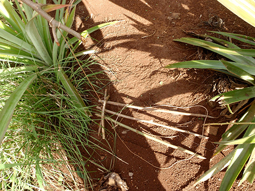 After lunch we visited a farm that grew the biggest sweet potatoes I have ever seen in my life (18″ long and 7″ wide), and we saw tapioca (cassava), pineapple, and taro being grown as well. The highlight of that visit, however, was the ingenious rooster trap they’re rigged to keep the birds from raiding their crops. It was made of a bent twig rigged with a noose, held town by pressure against another bent twig buried in the ground. The trigger as a set of sticks on top of which the noose was laid. If the rooster disturbed the sticks, the pressure holding the large bent twig down would be released, and it’d snap up, snaring the rooster’s foot in the noose on the way. Here’s a photo, cuz it’s hard to explain: