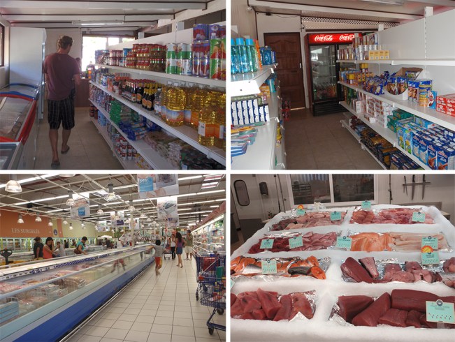 The top 2 photos show the entire contents of one magasin in the Tuamotus. There are no fresh goods available. The bottom two show the frozen food section and one of the 4 fresh seafood counters in Tahiti. With this sort of disparity, it's no wonder we go crazy buying in big cities.