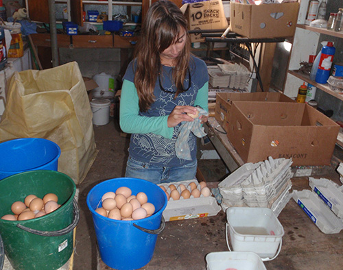 Mornings here consist of greeting Perry the paradise duck on the porch, then going around to all the hen houses and collecting eggs, refilling feed buckets, and letting the hens out for the day. They’re free range, but they naturally tend to go home to roost at night, so Len and Kate, our hosts, shut them in each evening around sunset so they’re safe from predators, and they don’t develop any bad habits like laying eggs in the woods. We bring the eggs back to the main barn and wipe down any dirty ones, then sort them into cartons for delivery to some of the country stores and restaurants that Orchard View supplies. We get about 25 dozen a day, and Jason and I get to take home enough to make breakfast each morning. I’ve learned all kinds of things about hen habits and the nature of eggs, like the fact that you don’t want to wash eggs before packaging them if you can help it, because they’re naturally covered with a kind of bacteria, referred to as a bloom, that makes them slightly shiny and protects their porous shells from letting in bad bacteria while the eggs await consumption. You can’t always get away with not washing the eggs however, because they sometimes have some less appetizing chicken products on them, or they get muddy if the chickens have come in from mucking about in the mud all day and then go to laying.